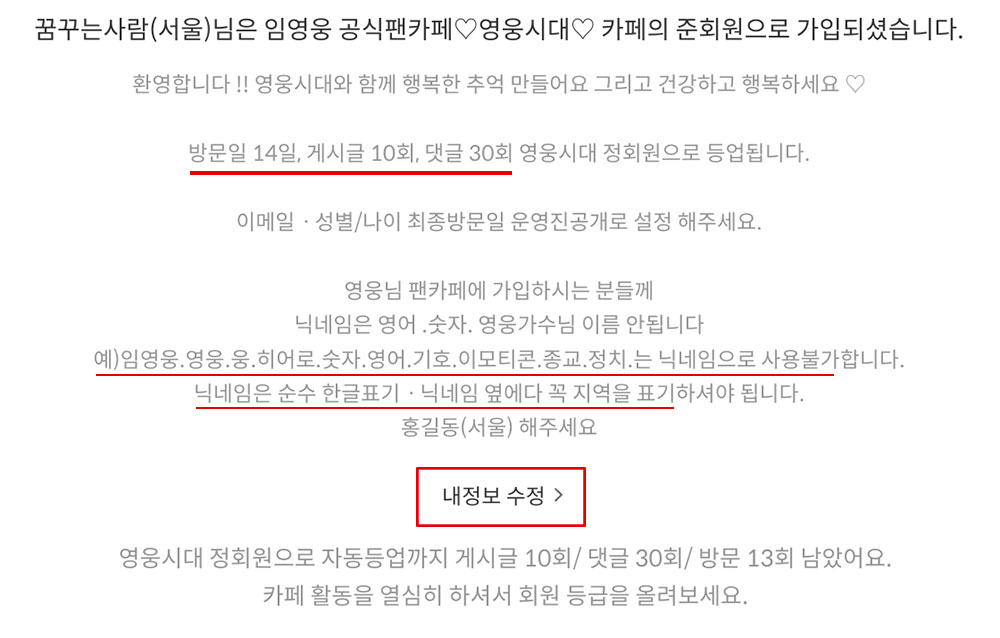 가입하실 때 주의하실 점은 닉네임을 닉네임(지역)으로 설정하셔야 된다는 점입니다. 그리고 닉네임엔 임영웅님 이름만 들어가는 건 안 됩니다(예시: 임영웅(서울) - 불가능, 꿈꾸는영웅(서울) - 가능). 임영웅님 본인도 글을 쓰시는 곳이기 때문에 영웅님 이름을 닉네임으로 해둔다면 헷갈릴 수 있겠죠?